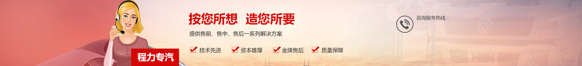 程力專用汽車股份有限公司銷售二十七分公司是定點生產(chǎn)各類專用汽車的專業(yè)廠家,大型專用汽車制造廠。國內(nèi)園林綠化、石油化工、市政環(huán)衛(wèi)、壓力容器專用汽車制造商。注冊商標“程力威”牌,國家產(chǎn)品代碼:“CLW”。東風(fēng)、解放公司的重要合作伙伴,主要從事各類專用汽車的生產(chǎn)制造業(yè)務(wù),同時也銷售各大型廠家的整車及配件。公司擁有自行出口權(quán),產(chǎn)品占據(jù)大量國外市場,其主導(dǎo)品種有灑水車、油罐車、垃圾車、吸糞車、吸污車、自卸車、廂式貨車、半掛車、清障車、隨車吊、高空作業(yè)車、教練車、散裝水泥車、化工車、消防車、汽車配件、水泥攪拌車、牽引車等八大系列100多個品種車型。同時批發(fā)東風(fēng)、解放、楚風(fēng)各種二類底盤。